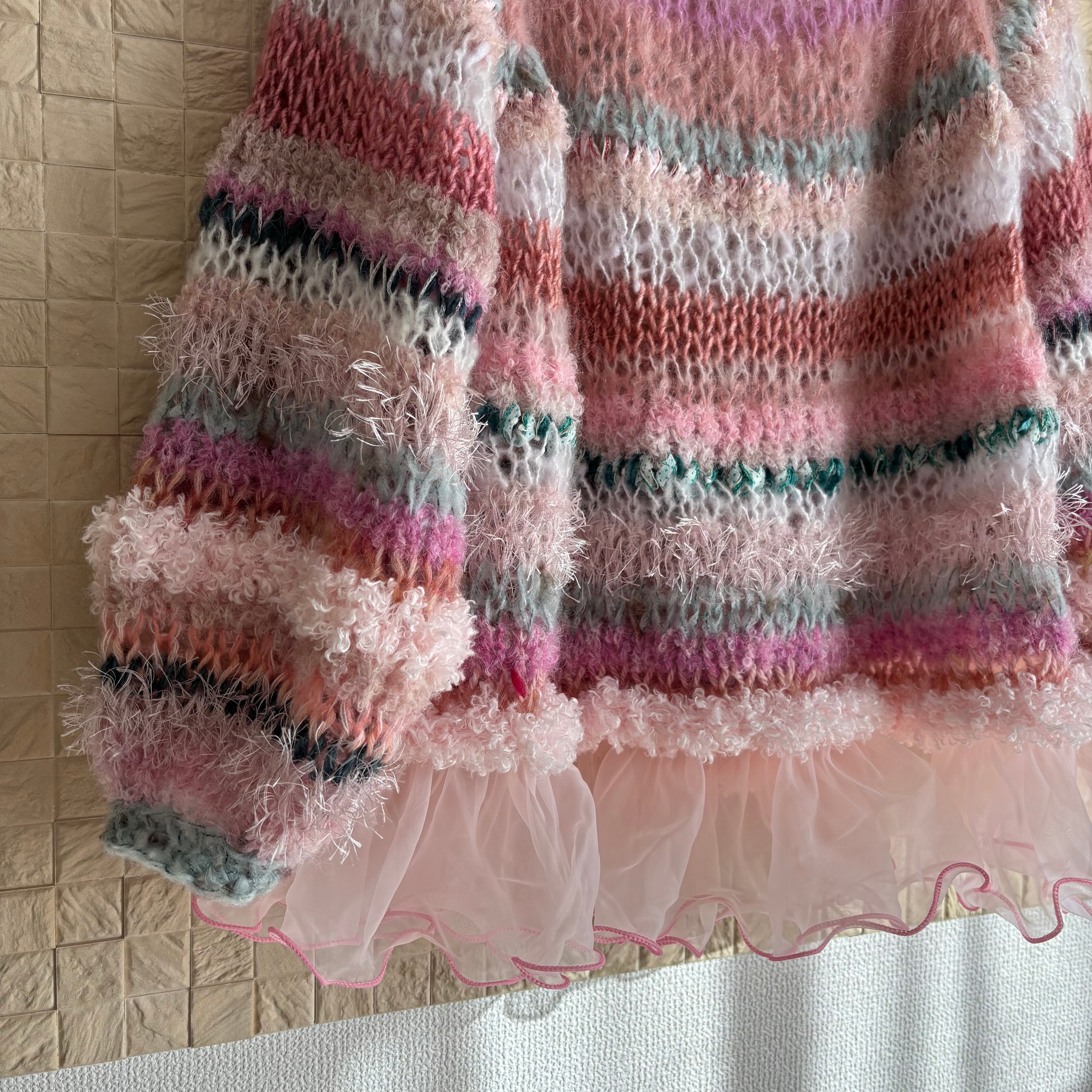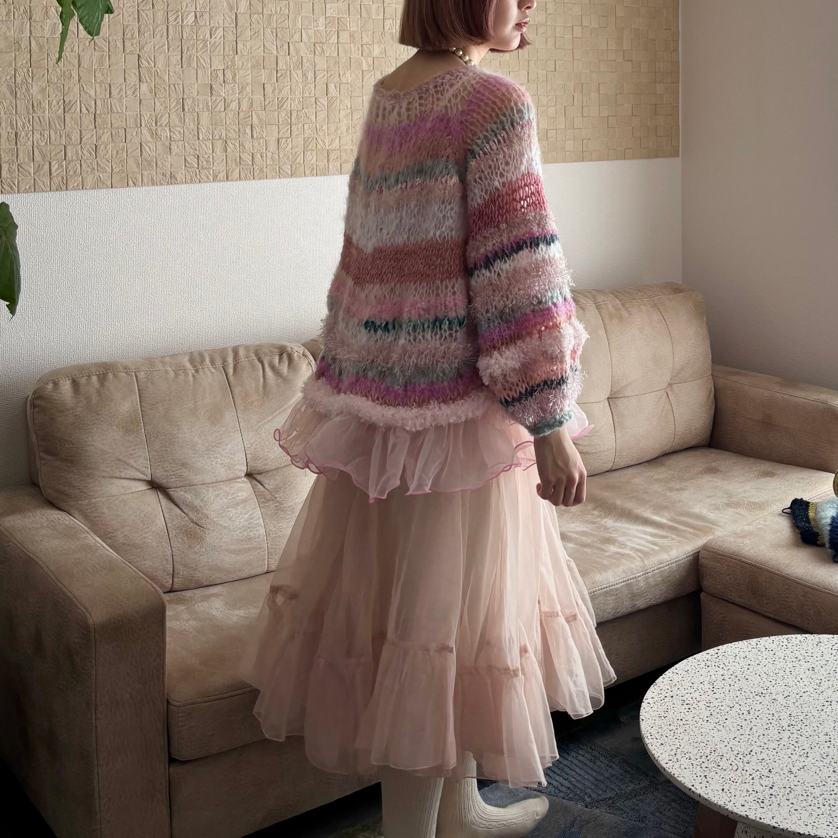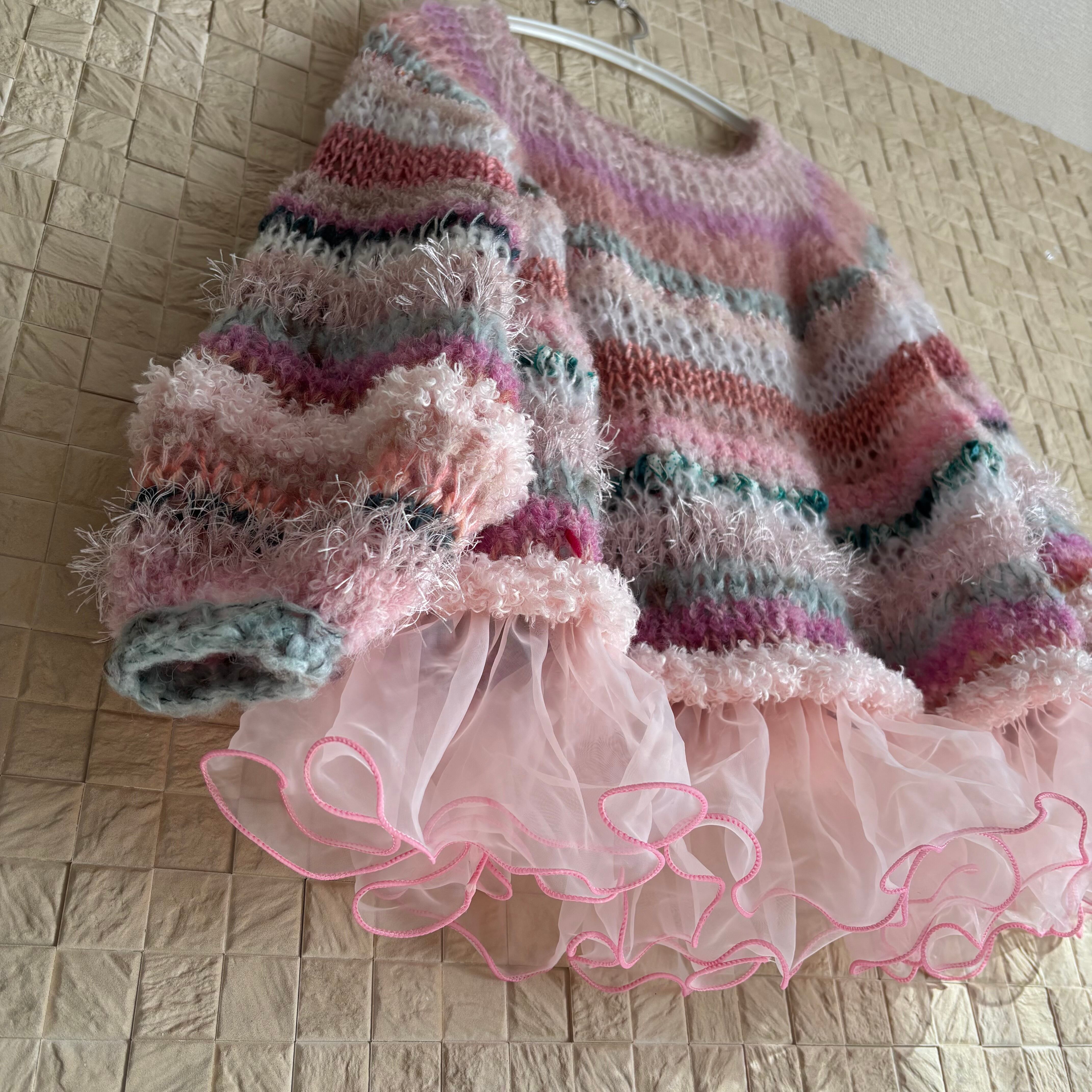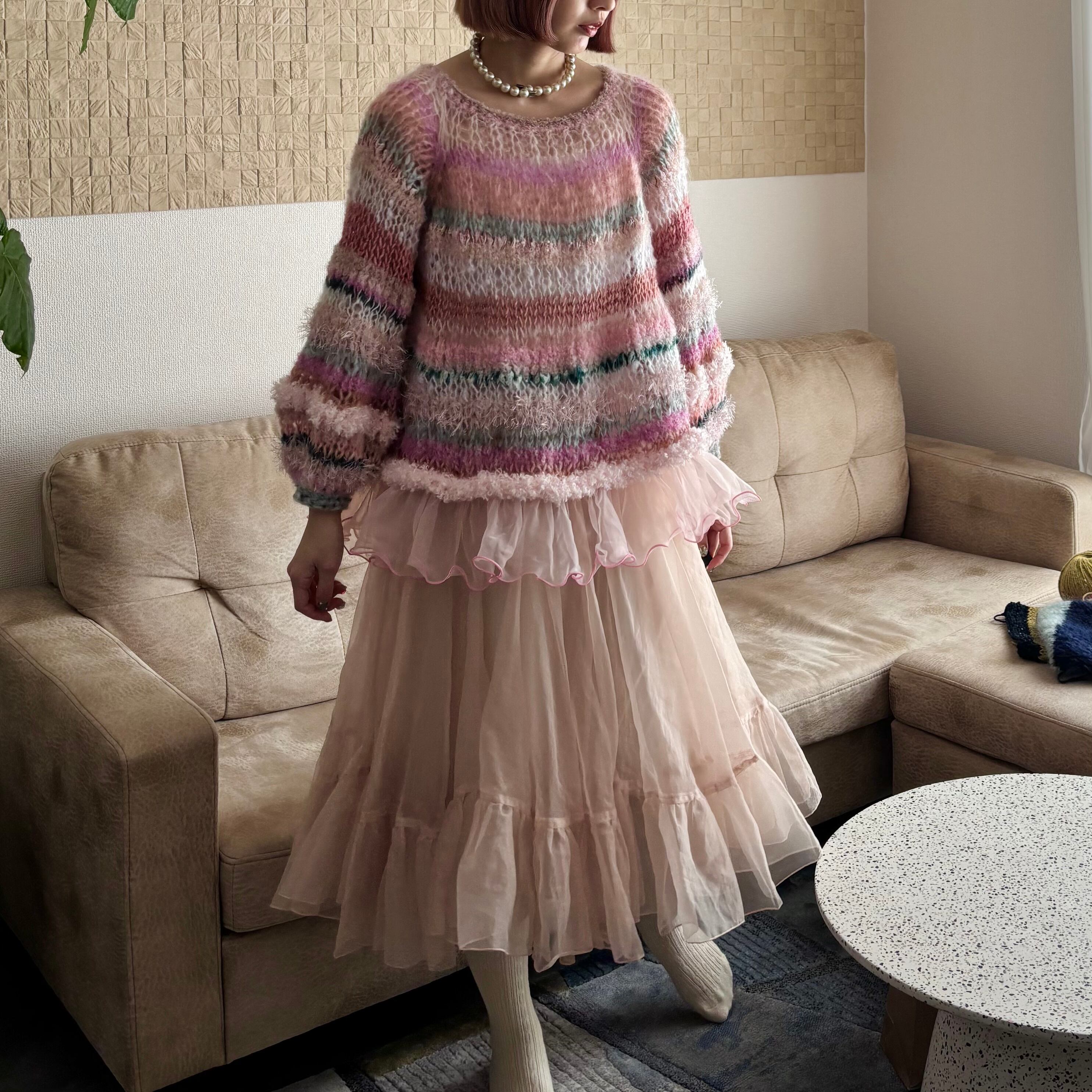 ふわふわモコモコなど様々な糸を使って編んだ温かみのあるニットです。裾をチュールにしてふわふわ感をプラスしました。