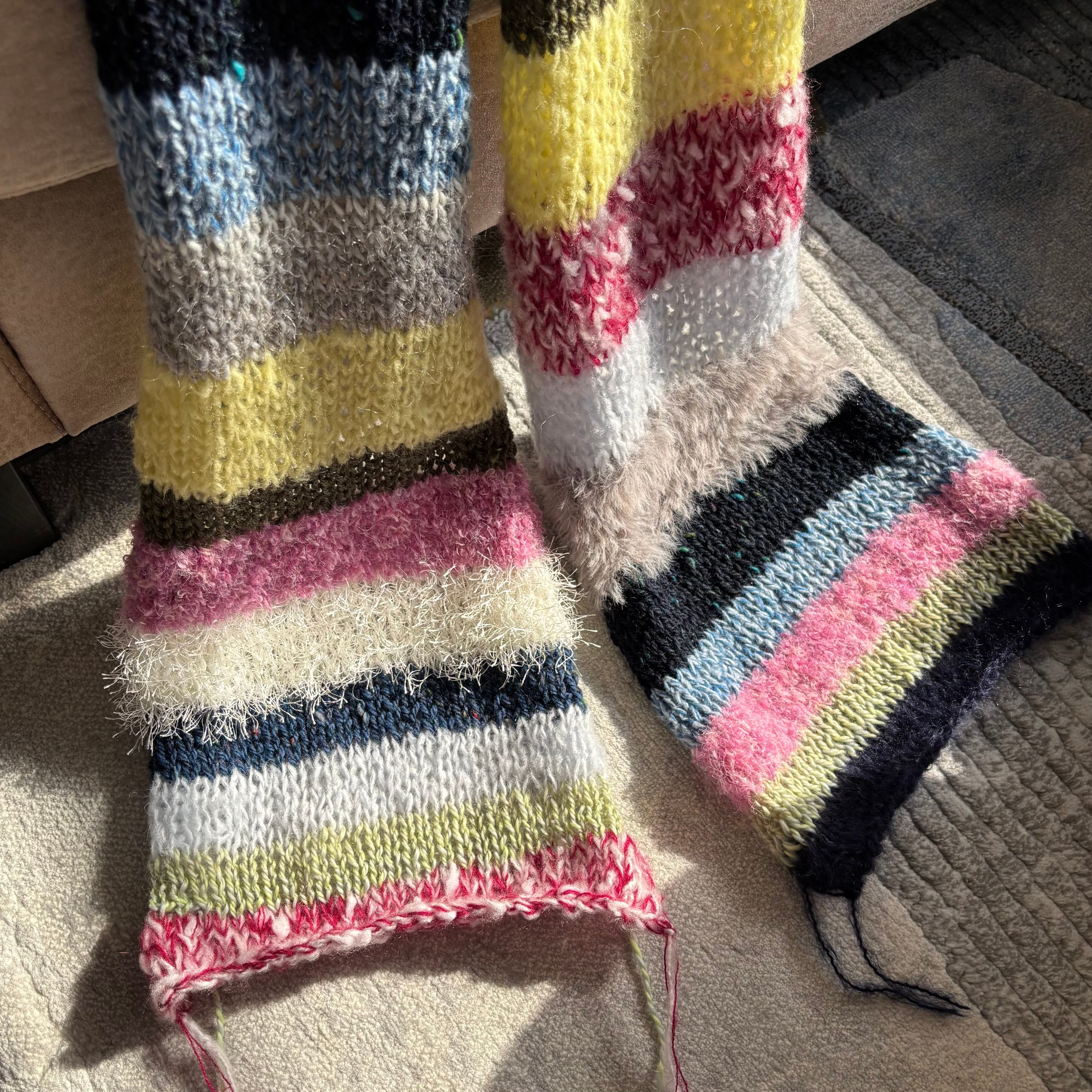 手編みならではのカラフルさや特別感を感じるマフラー。冬のアウターはシンプルになりがちですが、マフラーを着けるだけでぱっと明るくなります!プレゼントにもオススメです!