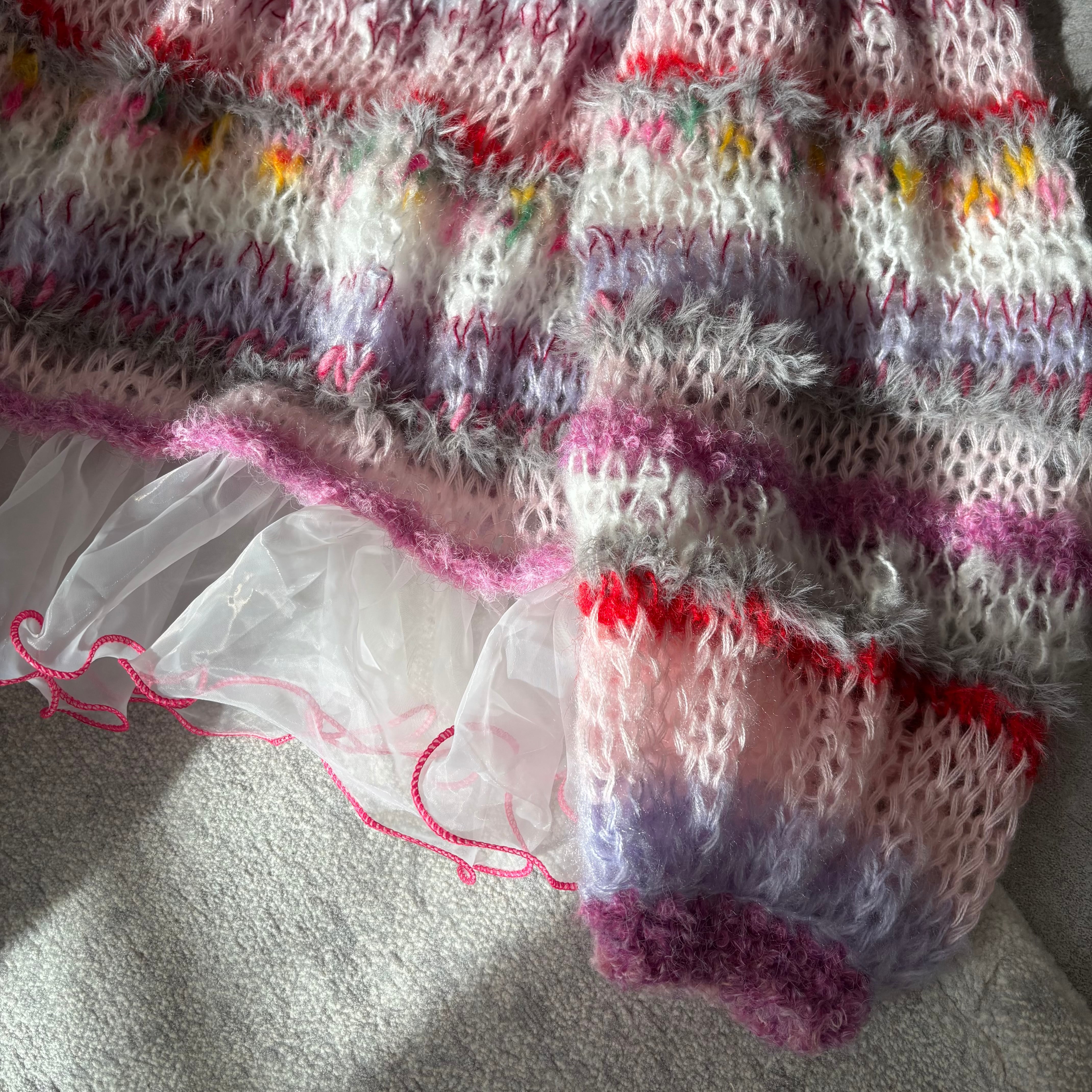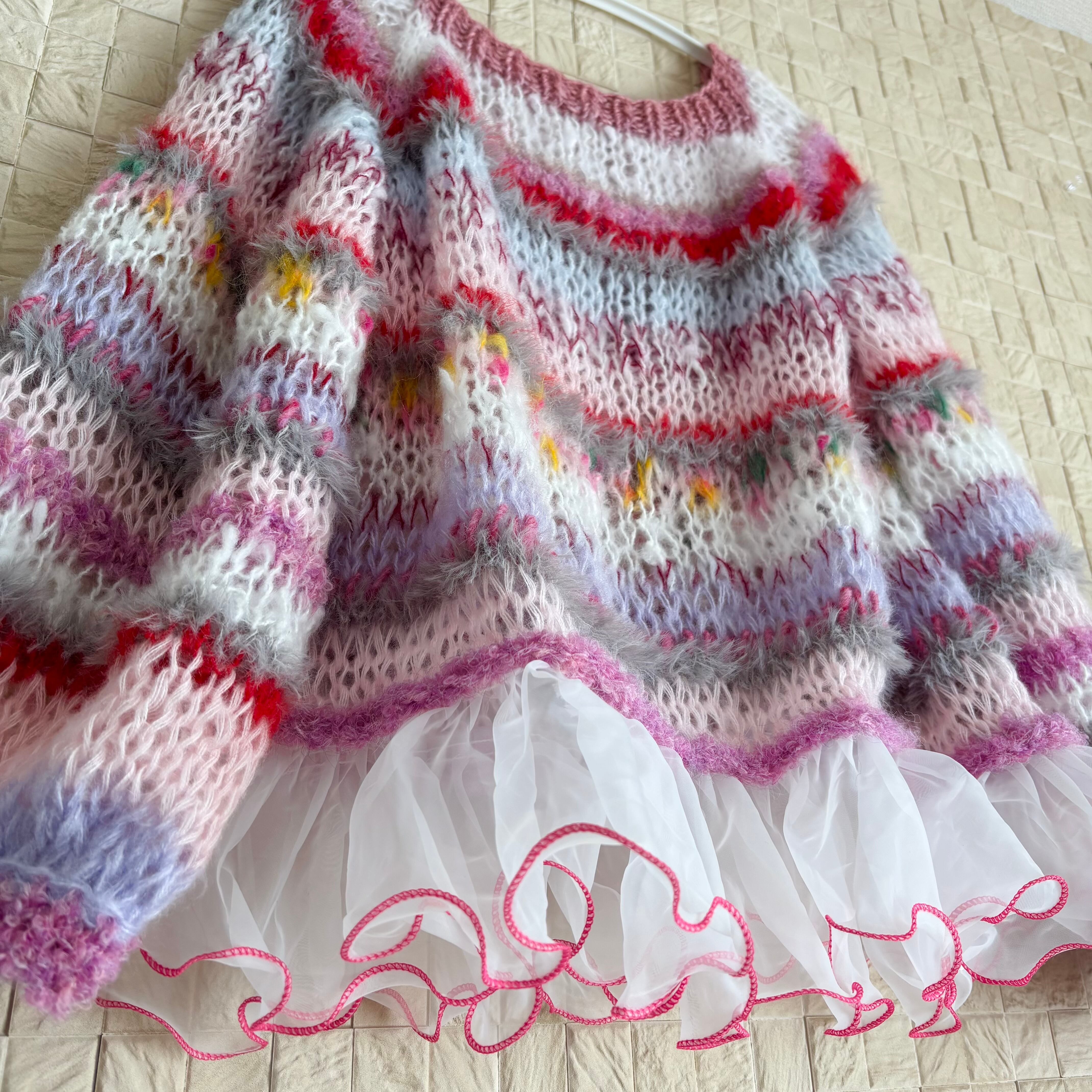 ピンクベースの手編みニットです。グレーのファーをアクセントに、裾をチュールにしてふわふわ感をプラスしました。