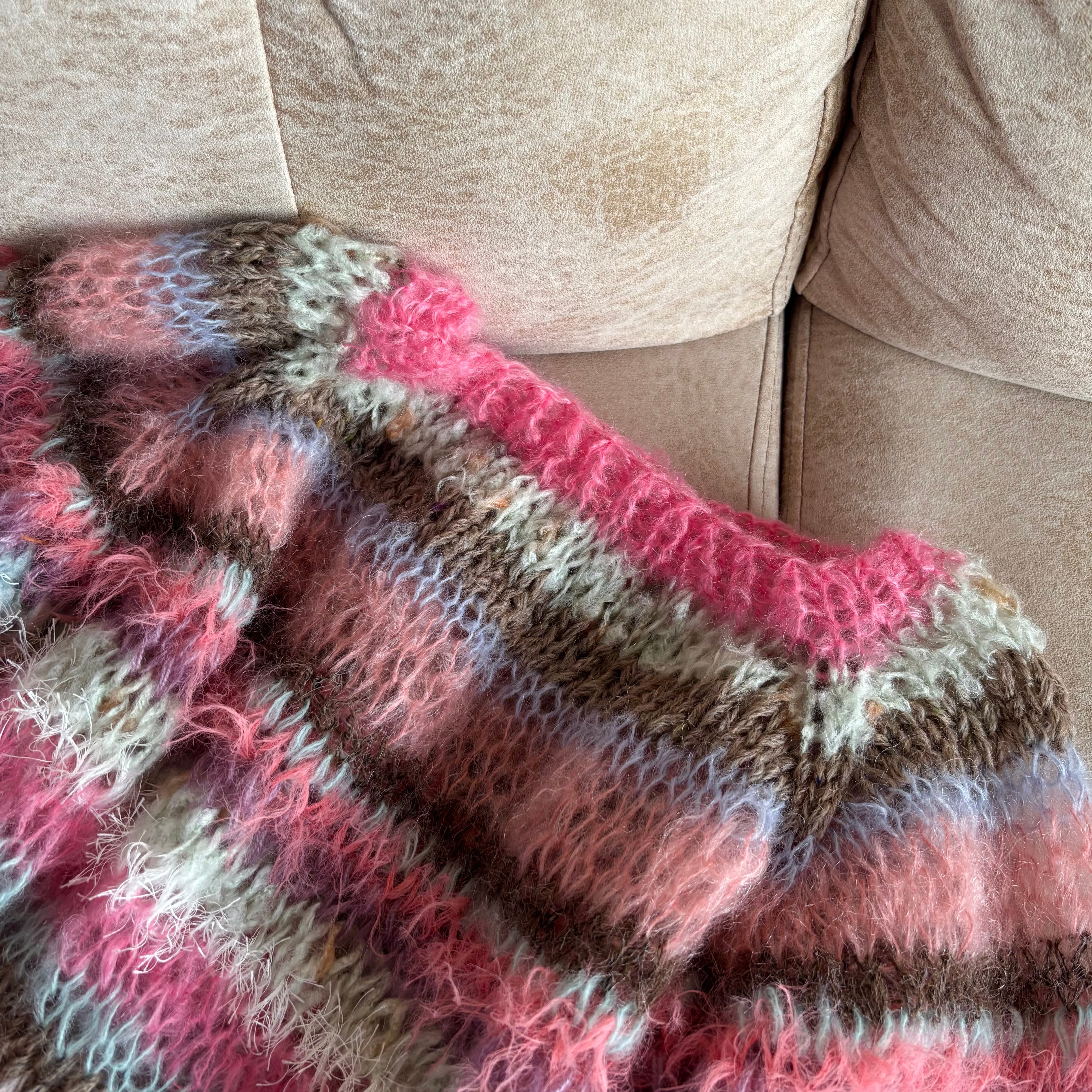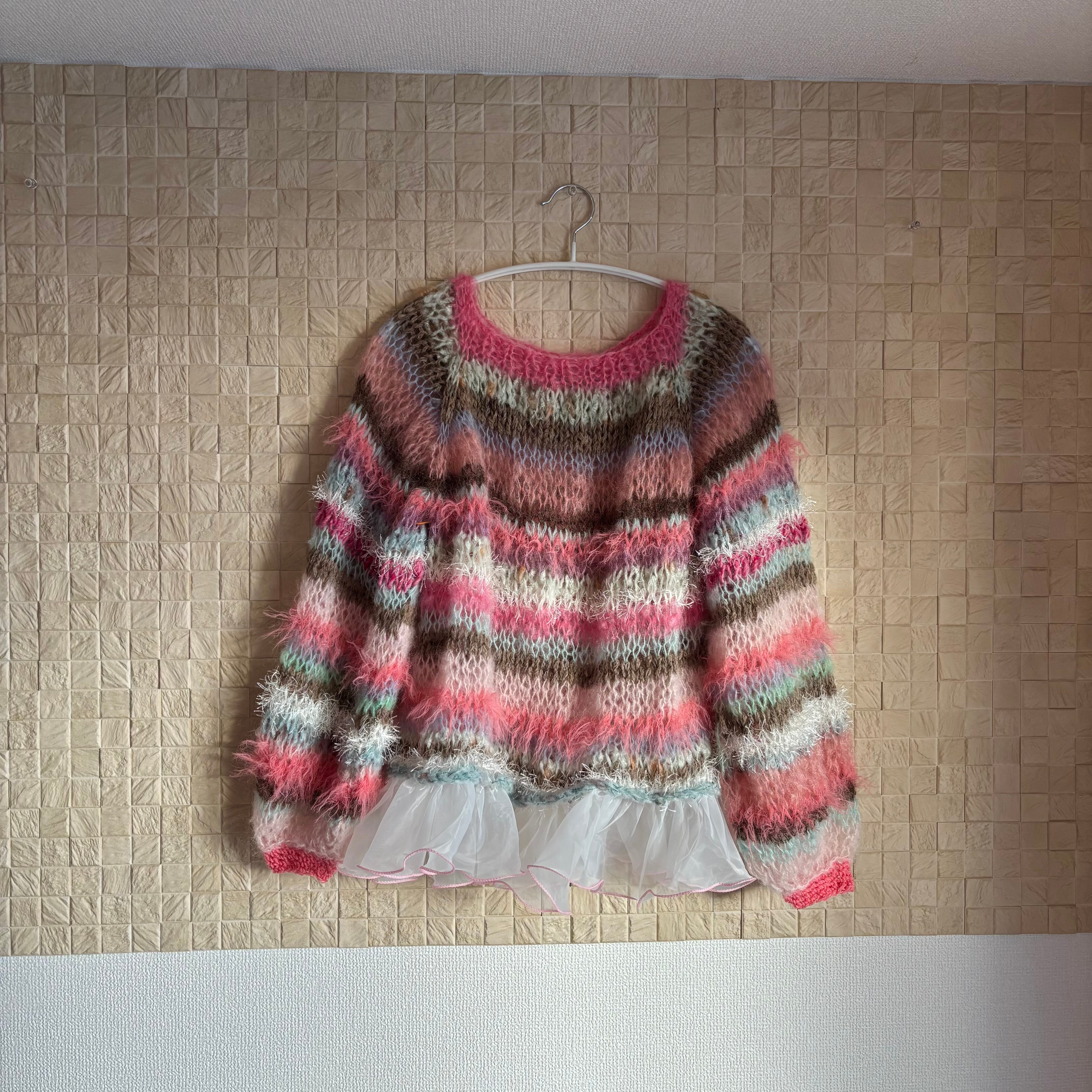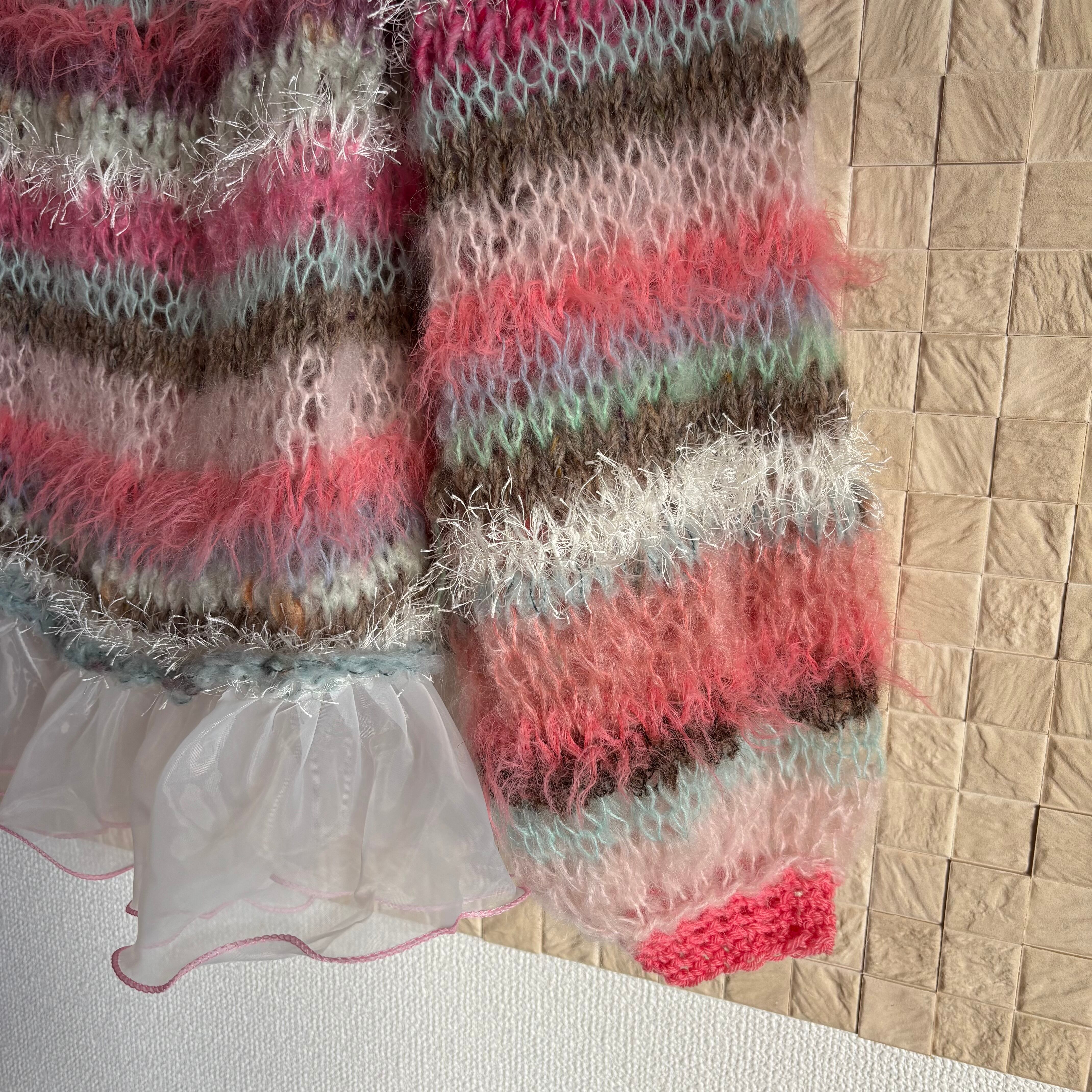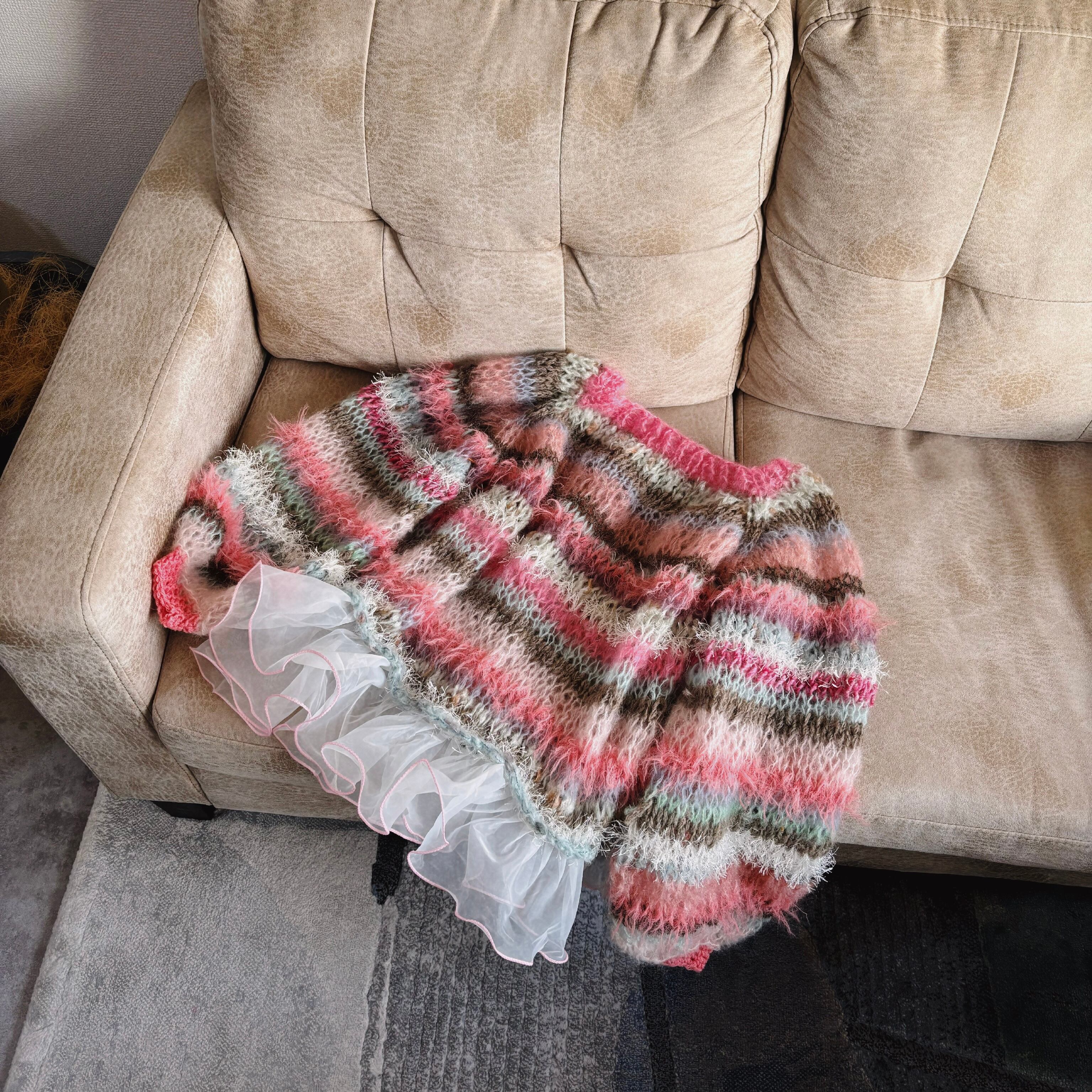 裾をチュールにしてふわふわ感をプラスしました。手編みの温かさとチュールの組み合わせがたまらなく可愛い一着です。