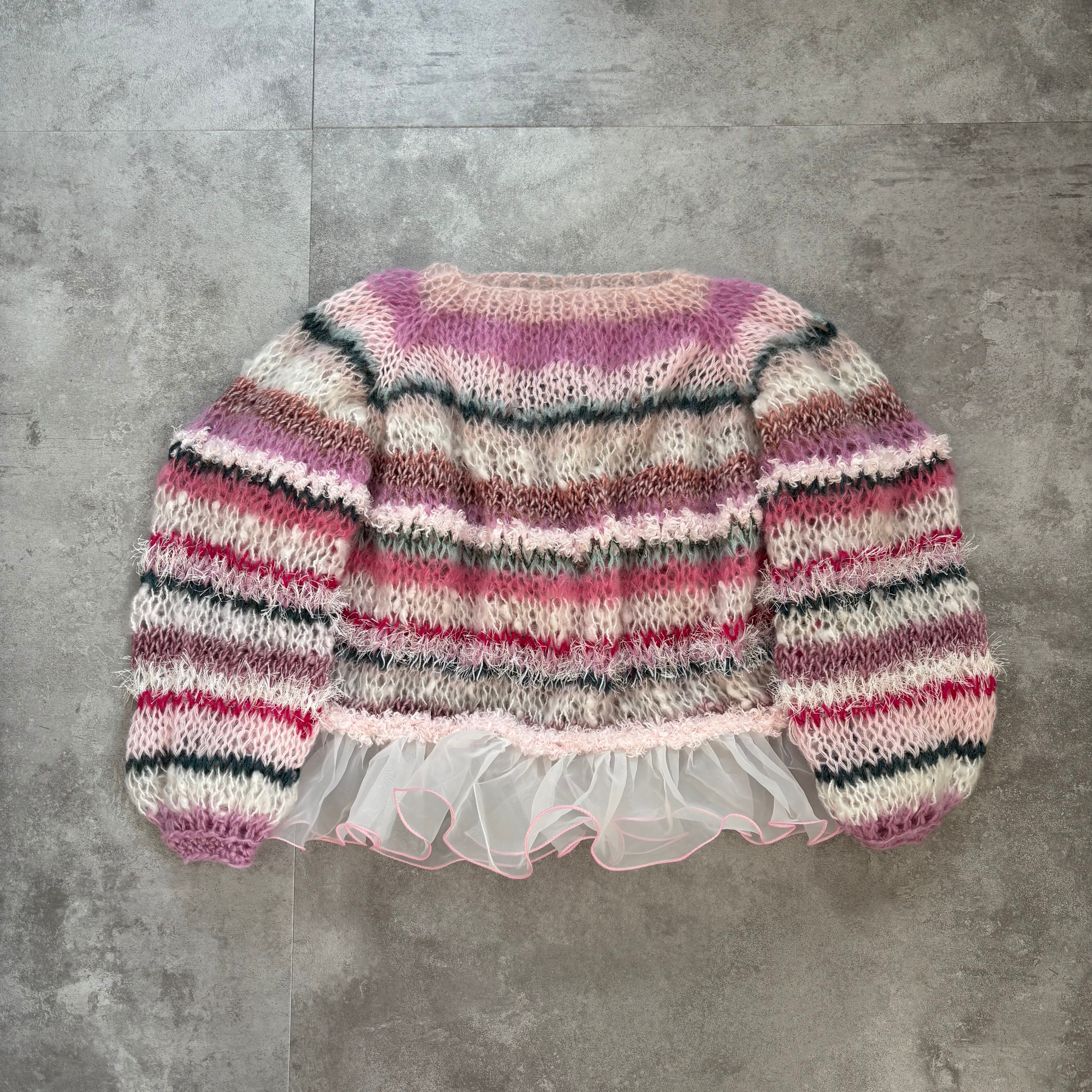 ピンクをメインに、甘くなりすぎないようにグリーンを合わせています。手編みの温かさとチュールの組み合わせが可愛い一着です。