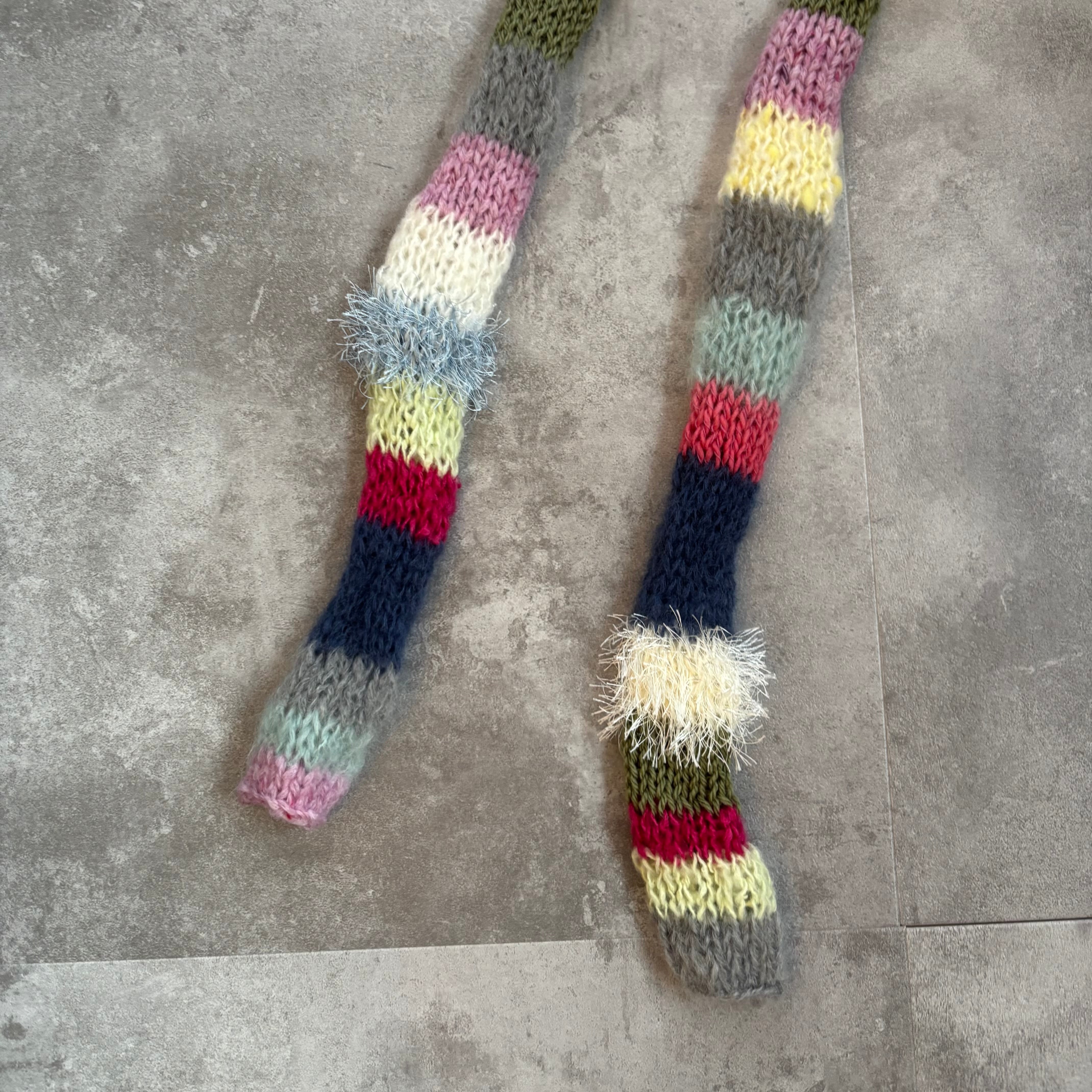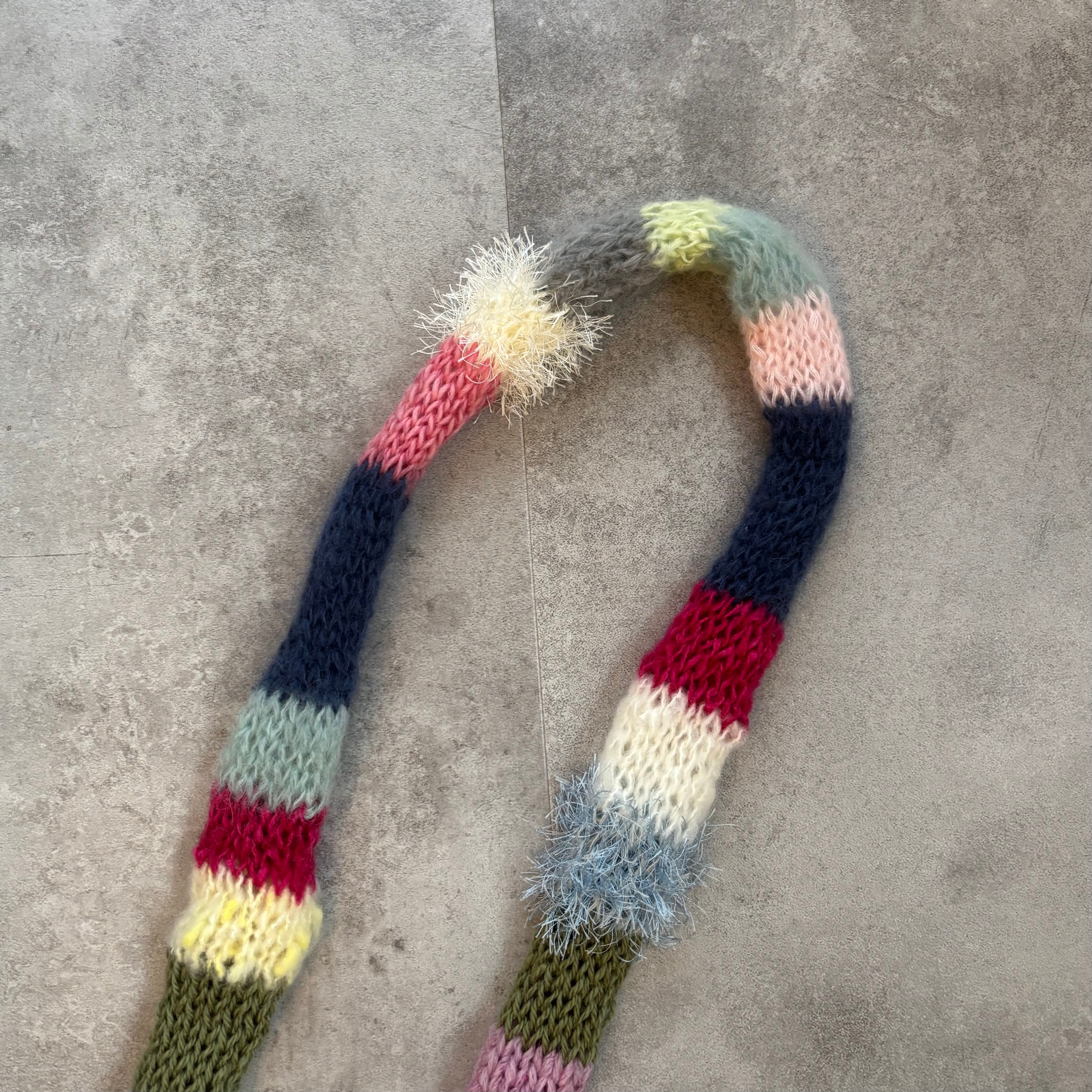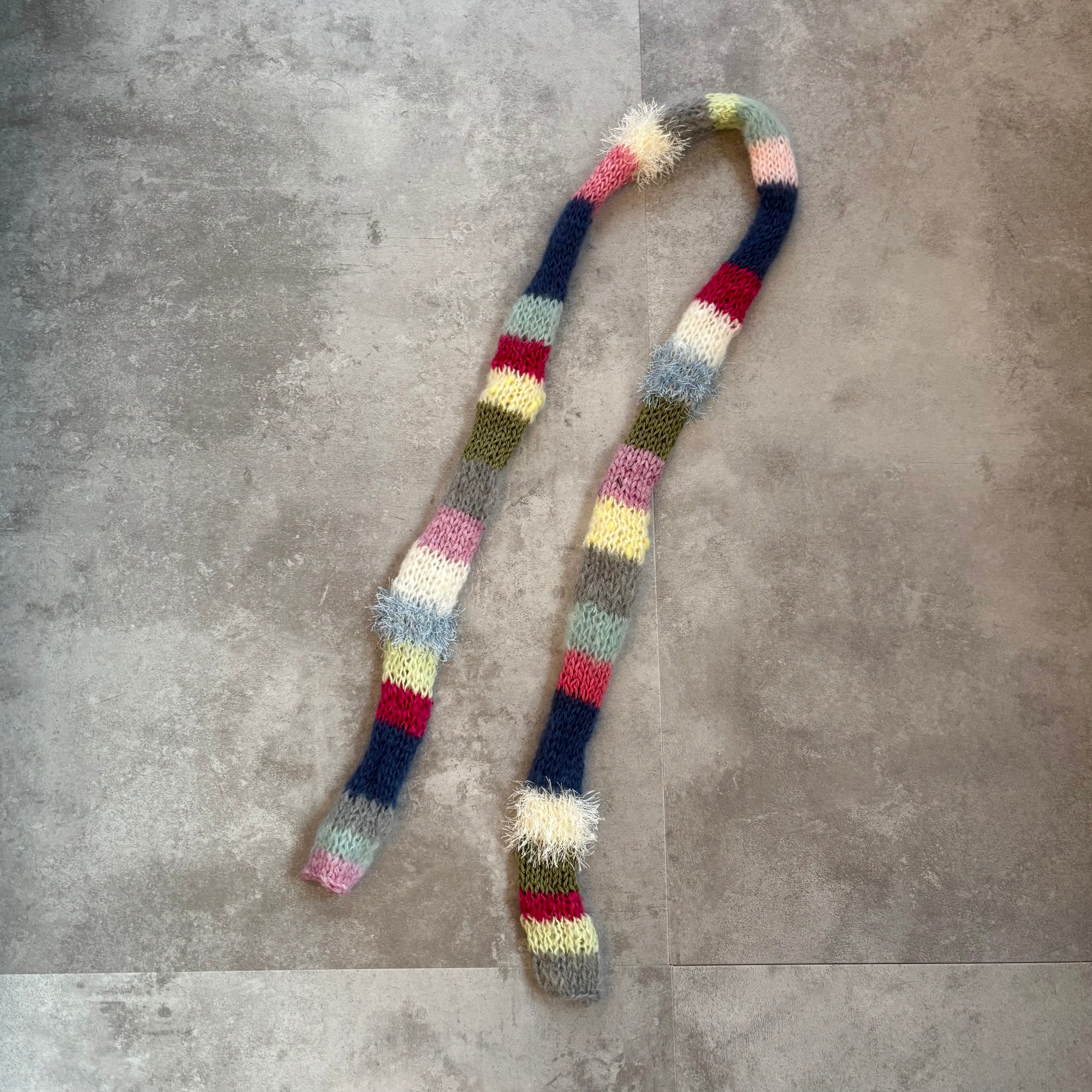 手編みならではのカラフルさや特別感を感じるスキニースカーフ。コーディネートのワンポイントにおすすめです。
