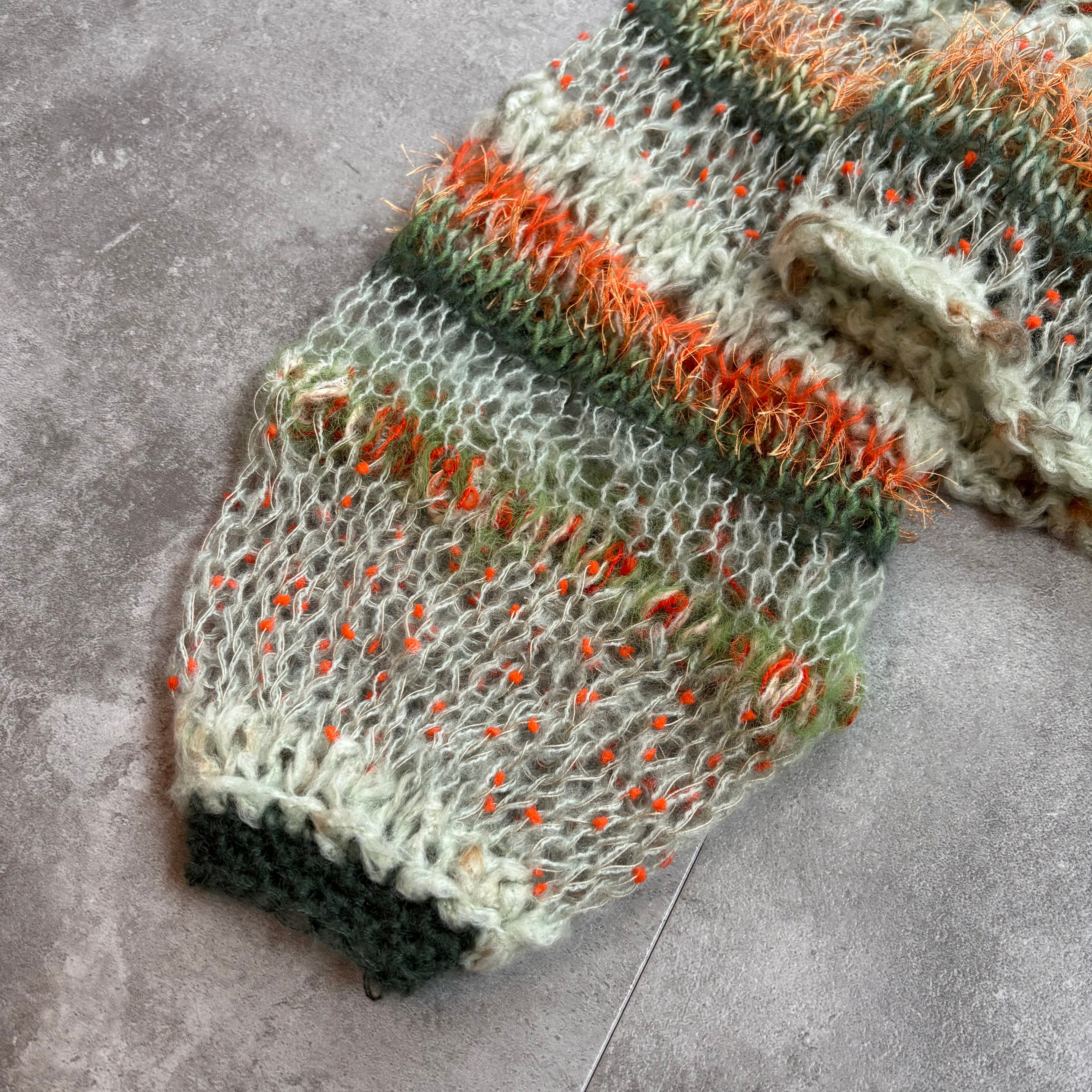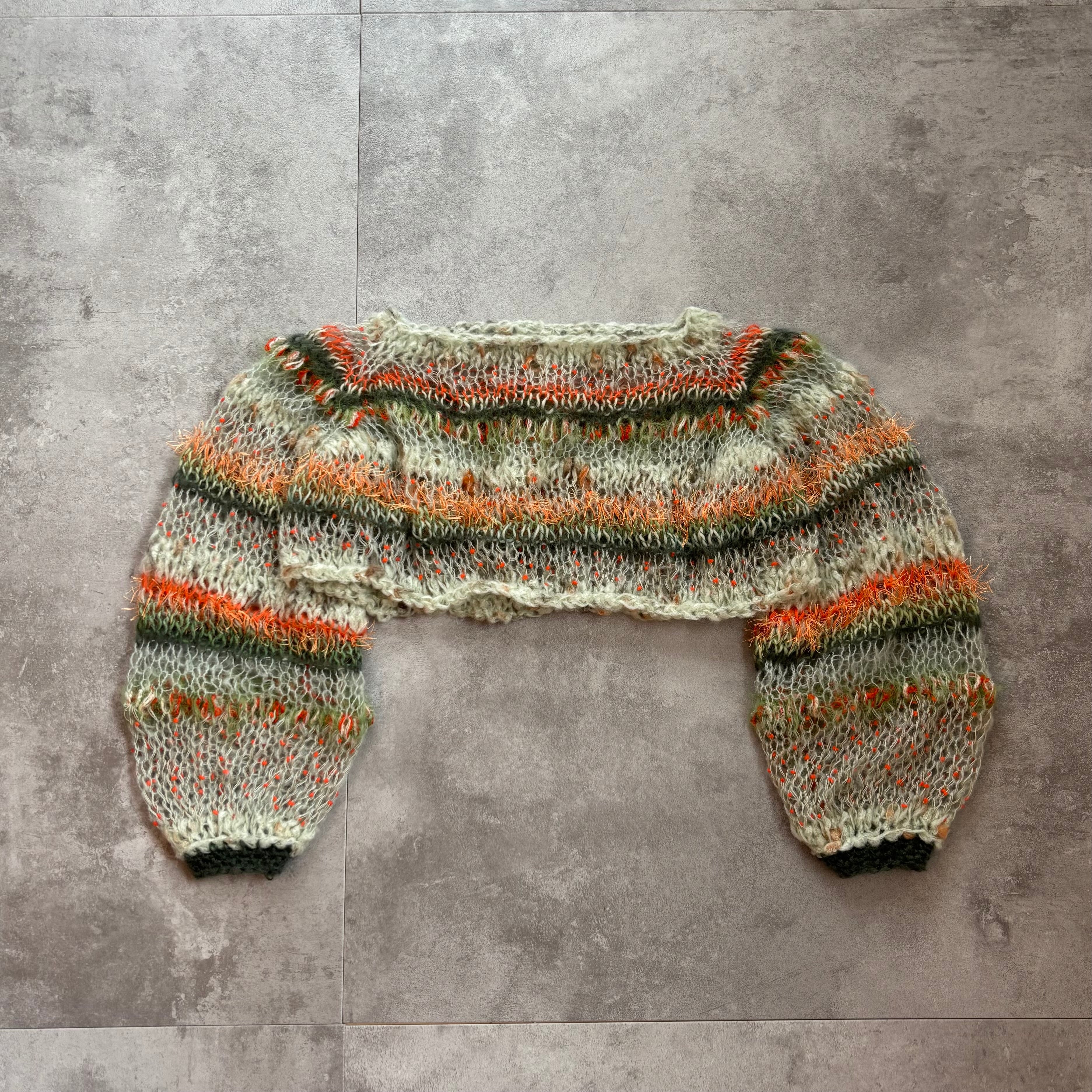 グリーンとオレンジをポップに詰め込み。ほどよく素肌を魅せてくれる、暖かい季節に着たくなる薄手のニットです。夏前くらいまで着れるように細い繊細な糸で編んでいます。インナーを入れてあげると秋冬も着用いただけます。