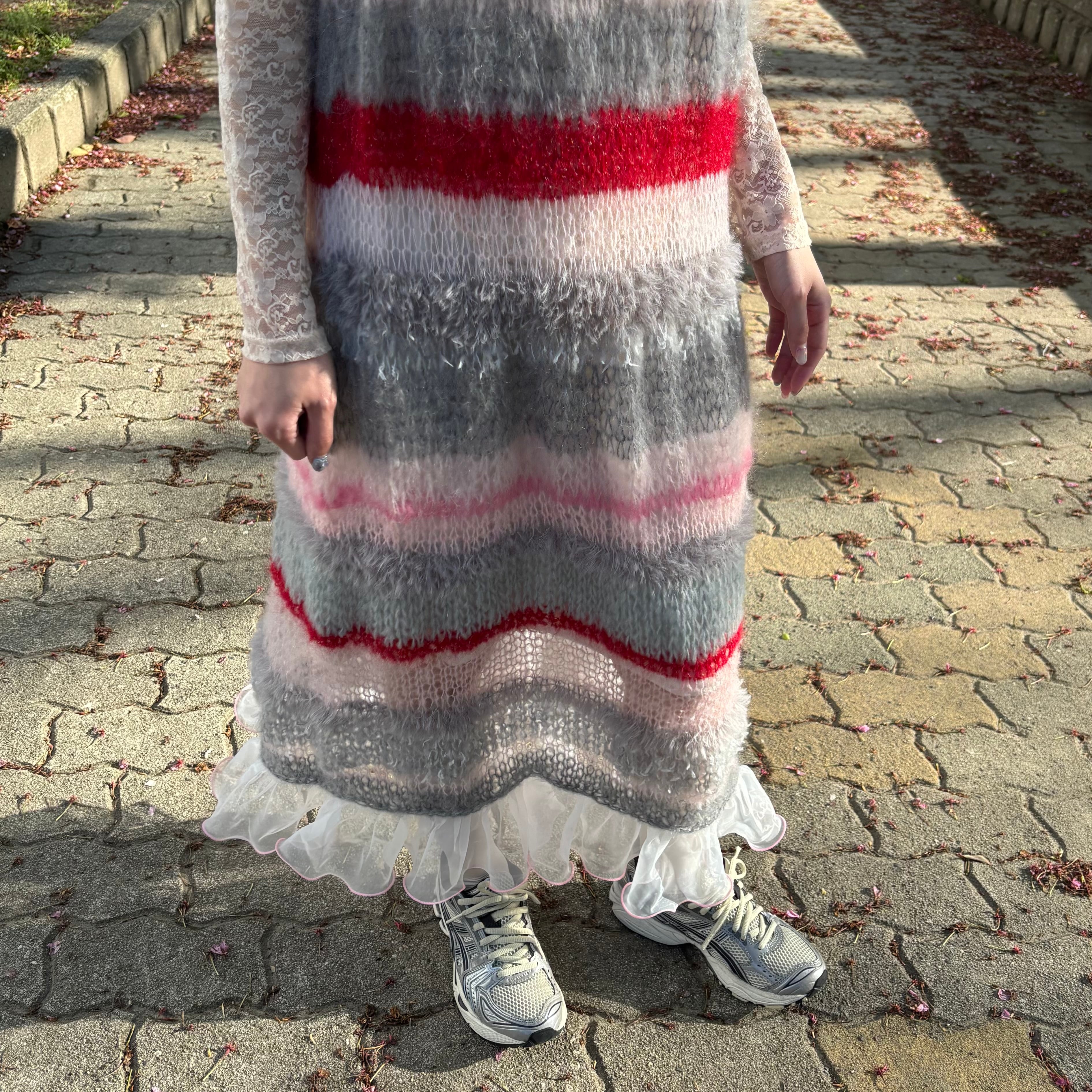 軽やかに揺れるチュールフリルが、ニットの質感に繊細なコントラストを生み出し、どこか儚い印象に。